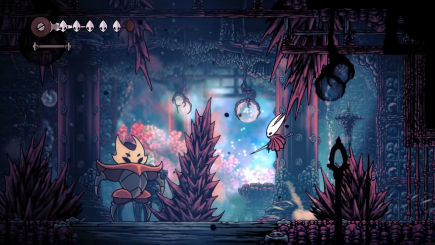 Die Spielwelt von Silksong, Pharloom, ist deswegen auch kein Themenpark mit dekorativen Kulissen, es ist eine gelebte, atmende Region, in der jede Ebene, jede Spalte und jede Verbindungsszene eine Funktion erfüllt. Anders als in vielen anderen Metroidvanias, bei denen Verbindungen häufig nachträglich eingefügt wirken, folgt Silksongs Kartenbau einem inneren Rhythmus: Pfade werden so gelegt, dass Rückkehr, Entdeckung und Wiederbegegnung komplementär wirken. Wir bewegen uns öfter vertikal als zuvor, was Hornets Agilität betont. Doch diese Vertikalität ist nicht rein spielmechanische Diversifikation, sie erzählt auch, indem sie soziale Ebenen, historische Schichten und klimatische Übergänge in der Spielwelt markiert, vor allem mit Blick auf die allgegenwärtigen kirchlich angehauchten Metaphern. Die Entscheidung, Hornet als Protagonistin in den Mittelpunkt zu stellen, verschiebt Perspektiven, bringt neue mechanische Prioritäten mit sich und erlaubt Team Cherry, die Weltformel zu variieren, ohne die stilistische Identität der Serie preiszugeben.