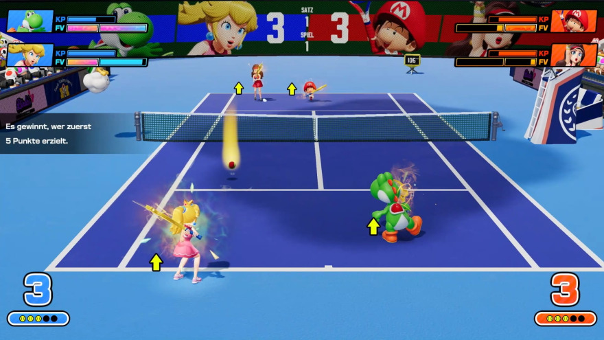 Letztere werden jetzt allerdings nicht mehr von Charakteren oder Power-Ups, sondern von spezifischen Tennisschlägern ausgelöst, von denen insgesamt 30 Stück mit jeweils eigenen Effekten im Spiel freigeschaltet werden können. Zu Beginn jedes Matches wählt ihr dann neben eurem Charakter auch den gewünschten Schläger aus, um euren Gegnern mit Feuer, Eis, Tornados, Schlamm, schrumpfenden Pilzen oder anderen Hindernissen das Leben zu erschweren, sobald sich die neue Fever-Leiste im Verlauf eines Ballwechsels entsprechend gefüllt hat. Wie schon im Vorgänger Aces können die Spezialeffekte natürlich mit gutem Timing wieder zum Absender zurückgesendet werden und auch die K.O.-Mechanik ist in abgewandelter Form wieder vertreten: Statt eines zerbrochenen Schlägers, wird euer Charakter nach zu viele Treffern für einige Sekunden verlangsamt oder muss in einem Doppel für einige Sekunden vom Platz. Und natürlich können Puristen, die ein ganz normales Tennismatch bestreiten wollen, diese Funktion in den meisten Modi des Spiels auch wieder abschalten. Statt also das bekannte Spielgefühl zu stark zu verändern, hat sich Camelot darauf konzentriert, den spielerischen Umfang zu erweitern und den Titel technisch auf die Höhe der Zeit zu bringen, was ihnen in beiden Fällen auch sehr gut gelungen ist.
