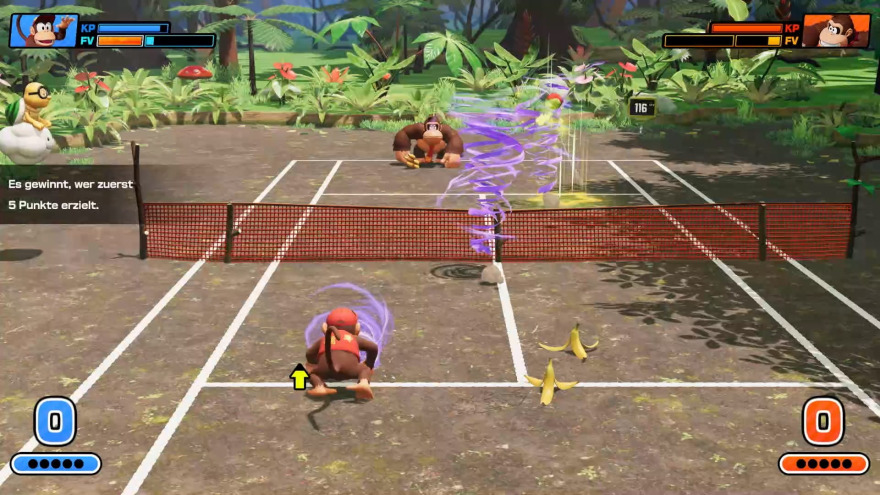 Auch technisch lässt Fever keine Wünsche offen und sieht auf dem heimischen Fernseher und auch auf der Konsole selber besser als jemals zuvor aus. Fast alle Modelle, Animationen und Texturen wirken im Vergleich zur vorherigen Switch-Version deutlich detaillierter und hübscher, ohne die Hardware der Switch2 damit vor spürbare Hürden zu stellen. Lediglich Donkey Kongs Dschungelplatz wirkt seit seiner Überarbeitung etwas trister, da viel Pflanzenwerk auf dem Platz und im Hintergrund entfernt wurde. Die Steuerung beschränkt sich im Match auf den Controlstick und die vier Buttons A, B, X und Y da Lob und Stoppball jetzt wieder durch das schnelle drücken von A und B, beziehungsweise B und A ausgelöst werden. Das funktionierte in unserem Test sehr gut, kann in den Optionen bei Bedarf aber auf eine der viele noch freien Tasten der Controller umbelegt werden. Die Ladezeiten sind erwartungsgemäß fix und auch online sind uns keine Probleme aufgefallen. Wie bei Mario-Spielen üblich, finden die meisten Dialoge in schriftlicher Form statt. Lediglich die Plauderblume, die in dem Spiel die Rolle des Kommentators einnimmt, wurde synchronisiert.