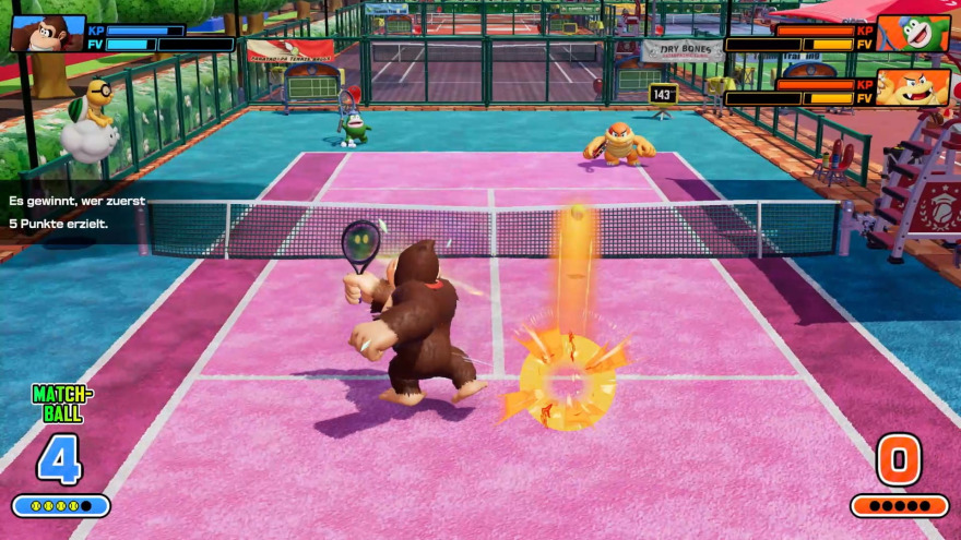 Mit 38 Charakteren, die alle aus dem Super Mario Franchise stammen, hat sich die Zahl der spielbaren Figuren mehr als verdoppelt, sodass nun wirklich jeder Fan einer bestimmten Figur auf seine (oder ihre) Kosten kommen sollte. Zusammen mit den zusätzlich freischaltbaren Farbvarianten einiger Figuren, den Tennisspielern und einigen besonderen Tennisplätzen bietet das Spiel mehr als genug Anreiz, um alleine oder mit anderen Spielern immer noch ein Match zu starten. Bei der Wahl der Modi lässt Mario Tennis Fever kaum Wünsche offen: Im Abenteuer-Modus erlebt ihr eine mit fünf Stunden vergleichsweise kurze Singleplayer-Kampagne in der Mario, Luigi, Peach, Wario und Waluigi beim Versuch Daisy zu retten in Babys verwandelt werden und sich nur durch die Macht des Tennis wieder entzaubern lassen können. Die Story ist ziemlich an den Haaren herbeigezogen und erinnert zum Teil mehr an ein riesiges Tutorial, aber euch werden währenddessen alle wichtigen Mechaniken beigebracht, sodass ihr im Anschluss bereit für echte Matches seid. Dennoch ist dieser Modus, der für Einzelspieler vielleicht besonders interessant sein dürfte, aufgrund seines vergleichsweise geringen Umfanges das einzige, was uns nicht vollends überzeugen konnte.